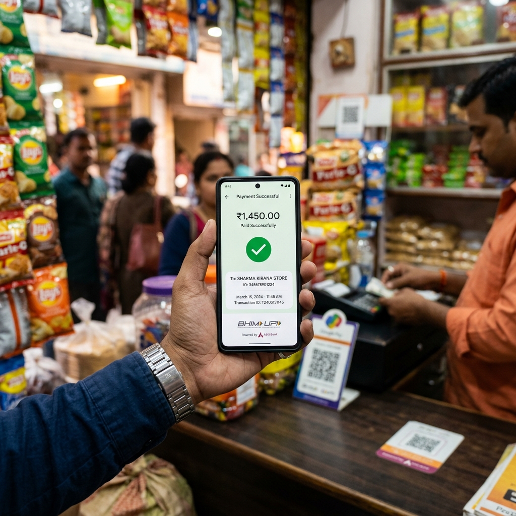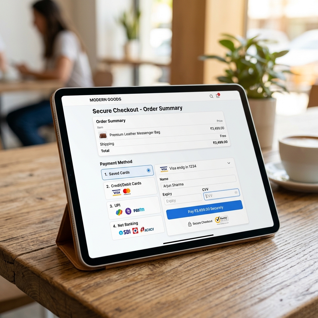 Customers pay bills or checkout using UPI, cards, or net banking.
